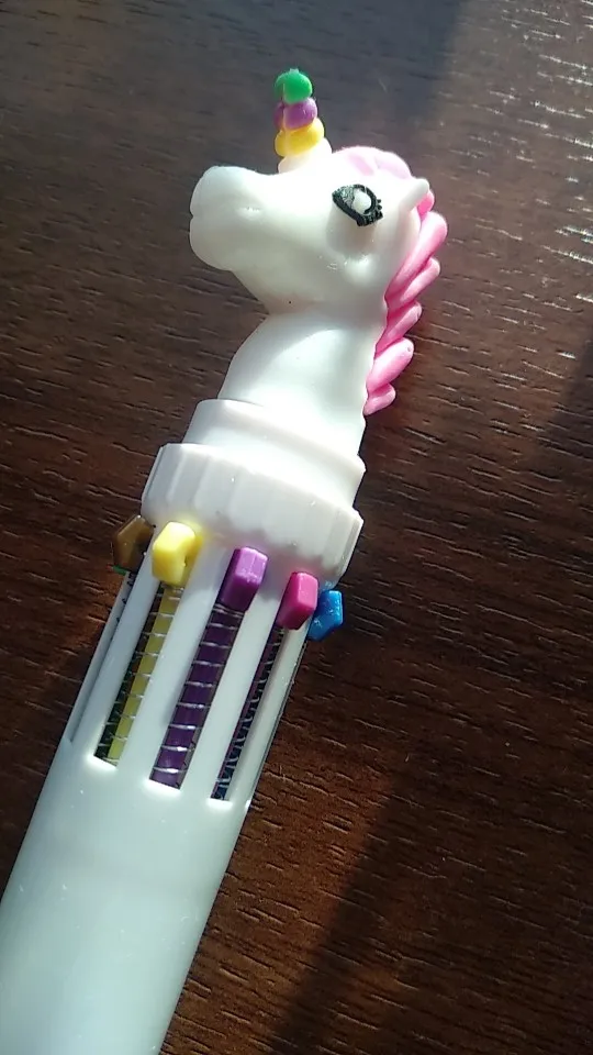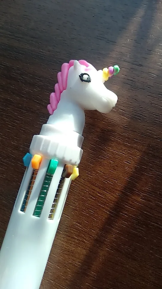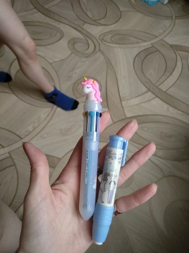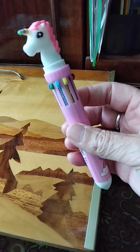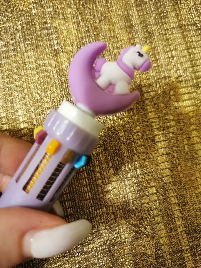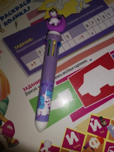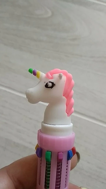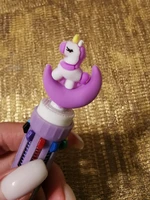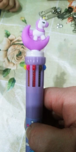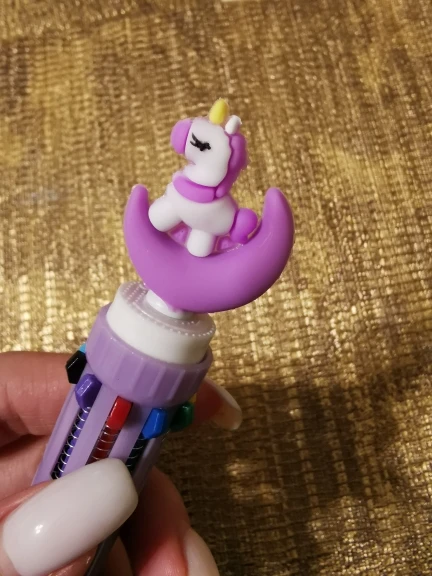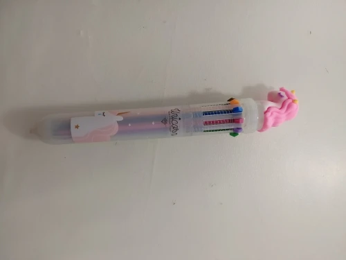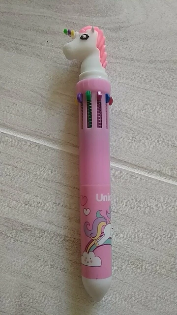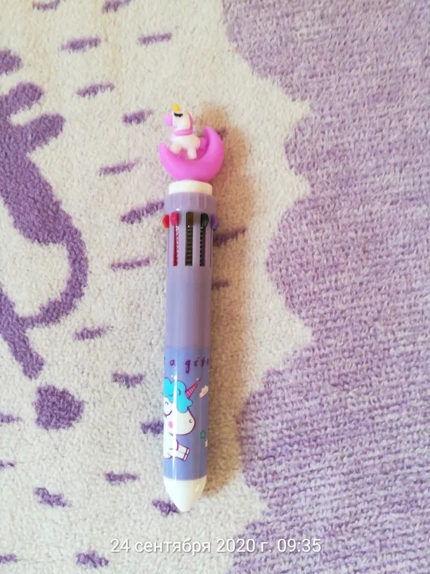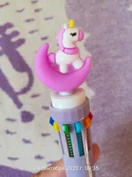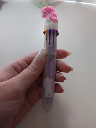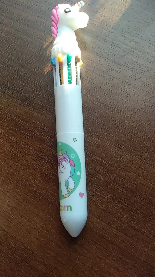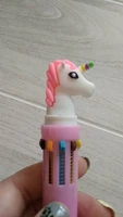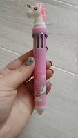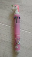 Nice pen. 10 colors. Everybody writes. Bright enough. An adequate price for such a pen. Funny unicorn head. No foreign smell. In the Vologda region, the parcel came within five weeks. Packed in bulk packing. No damage. Seller good.