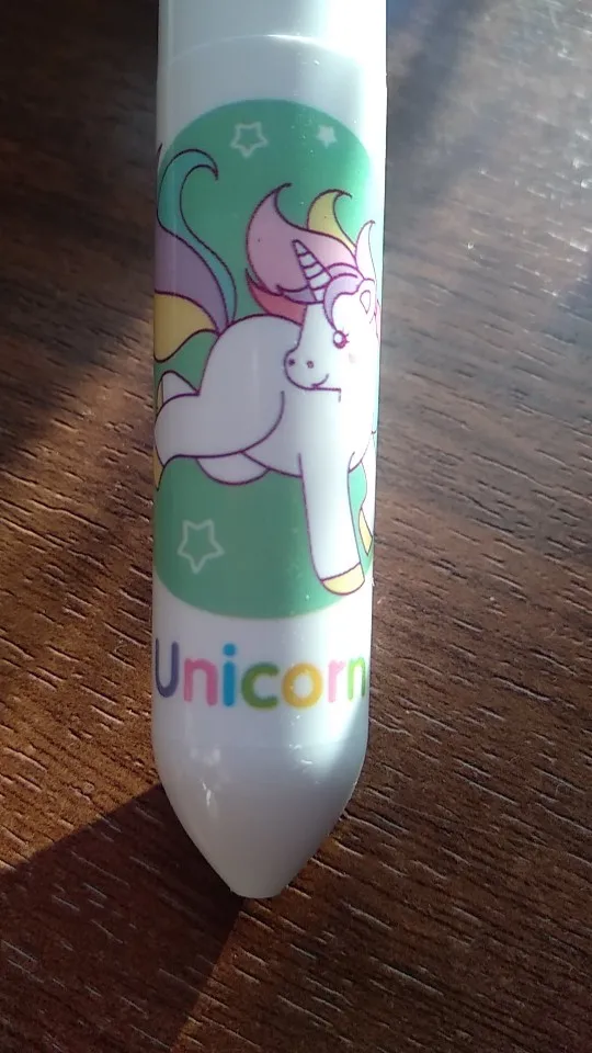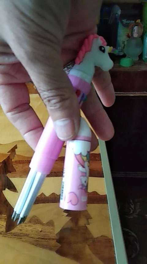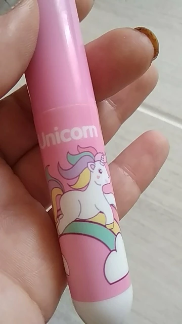 Ручку ждала очень долго. Но наконец получила. Ручка сама пластик. Голова единорога …силиконовая. Работает. В руках держать удобно.Она хороша, как подарок,