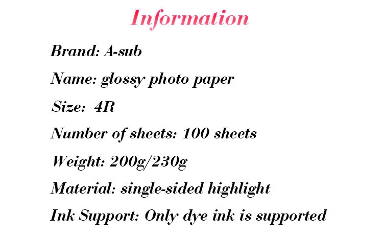 Specification: 100sheets Shiny Photograph Paper 4R 6inch 4×6 Waterproof For Inkjet Printer Paper studio Photographer Photographic Colour Coated