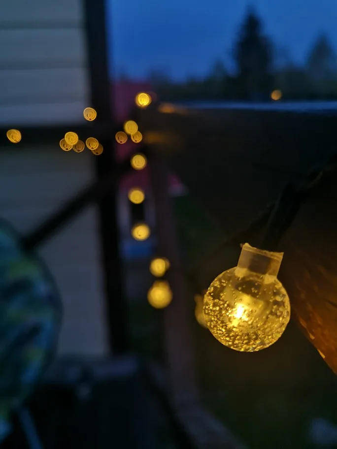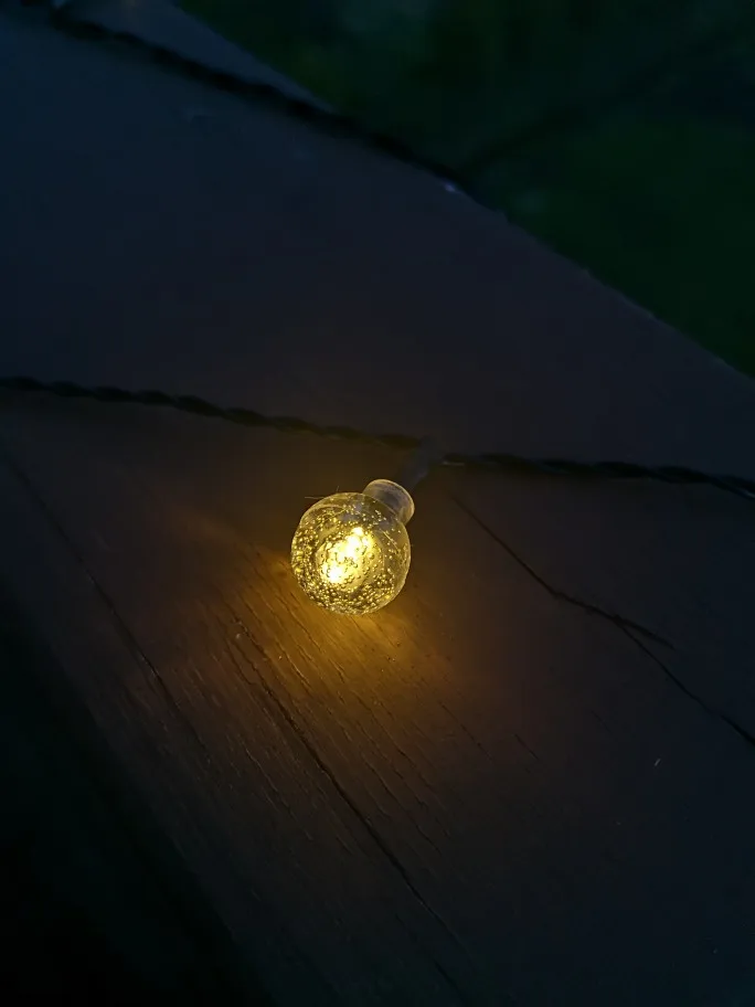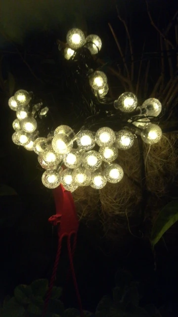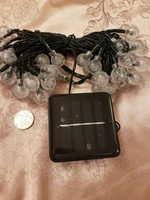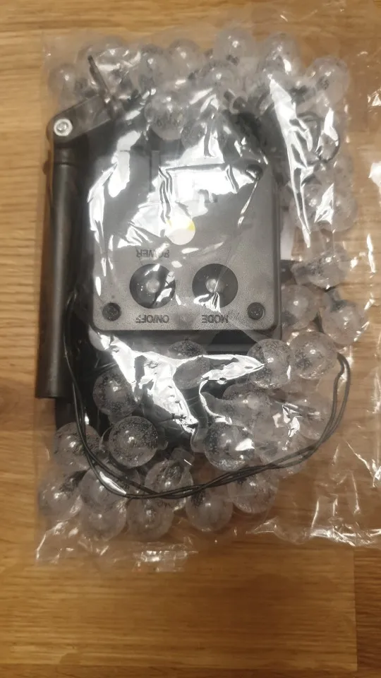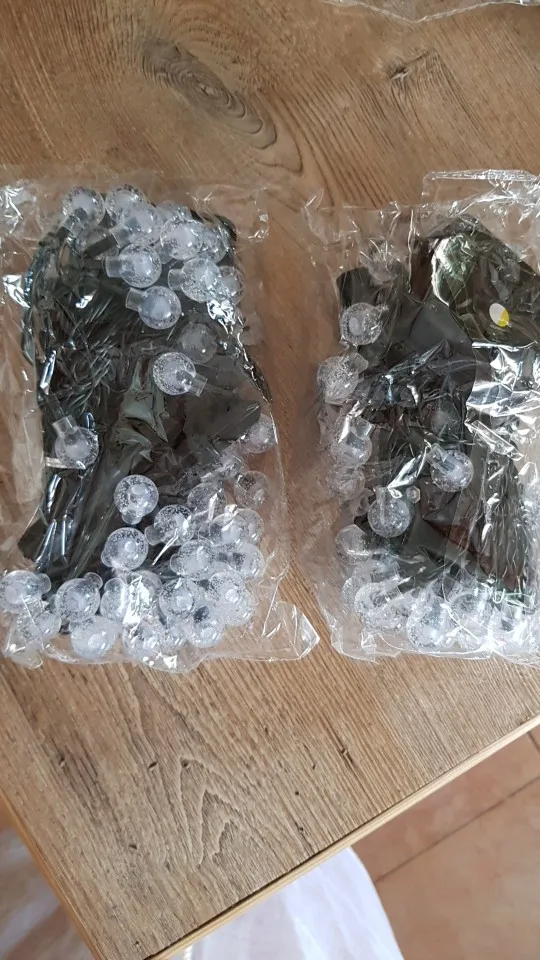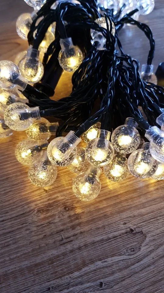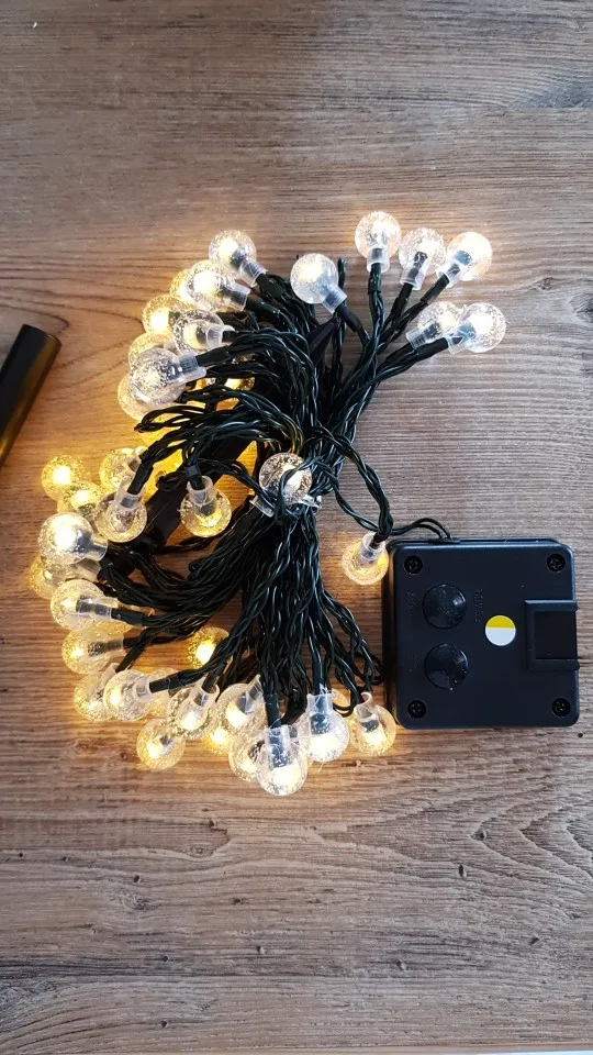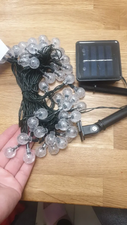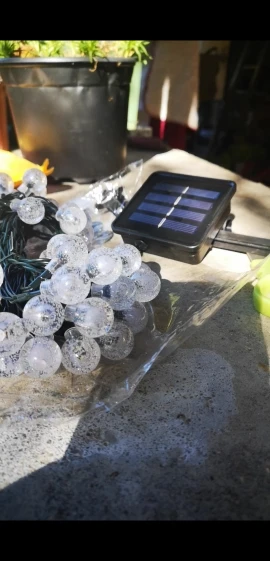 Немного затянулась доставка. Гирлянда понравилась. Некоторые шарики отвалились ещё при извлечении гирлянды из упаковки, не стал заморачиваться с клеем, просто так натянул их обратно. Шарики приятные, с пузырьками. Блок солнечных панелей очень хорошо приклеелся на стекло, не оттопыривает рулонную штору (рама холодная, алюминиевая, если что), со стеклопакетами не факт что прокатит такое. Вцелом, светит немного тусклее, чем ожидалось, но для декора – самое то.