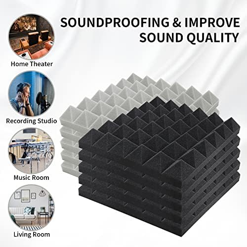 12 Pack Acoustic Panels With Self-Adhesive,2″ x 12″ x 12″ Fast-Restoration Sound Proof Foam Panels,Acoustic Foam Wedges Excessive Density,Pyramid Design Soundproof Wall Panels for House Studio (Black-Grey)