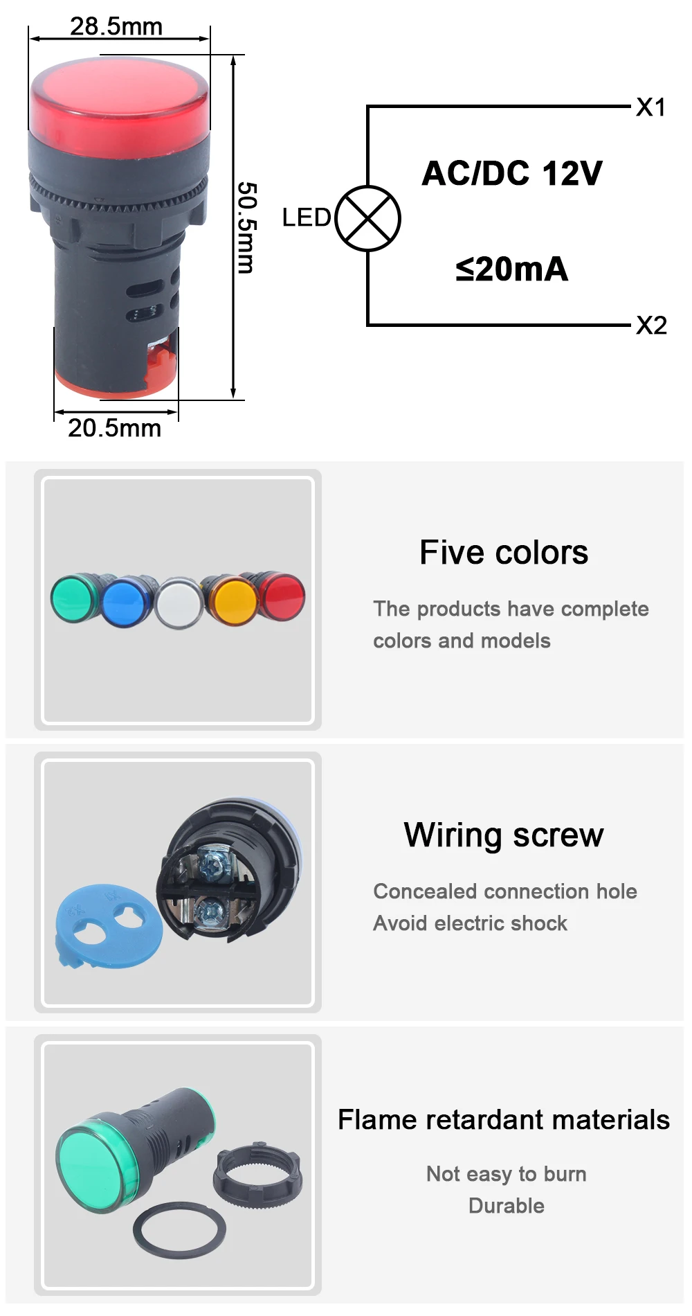 Specification: 1pcs 12V 24V 220V 380V 22mm Panel Mount LED Energy Indicator Pilot Sign Mild Lamp