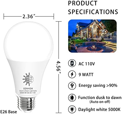 2 Pack GONHOM Nightfall to Daybreak Mild Bulbs Outside, 5000K-Daylight, 720LM, 9W(100W Equal) A19 E26 Automated On/Off LED Mild Bulbs, Nightfall to Daybreak LED Outside Lighting for Porch Storage Patio