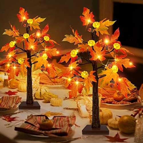 [ 2 Pack & Timer ] 20 Inch Lighted Fall Thanksgiving Maple Tree Decor with 48 LEDs Orange Lights Battery Operated Fall Halloween Tabletop Acorn Pumpkin Maple Tree for Autumn Harvest Dwelling Indoor Decor