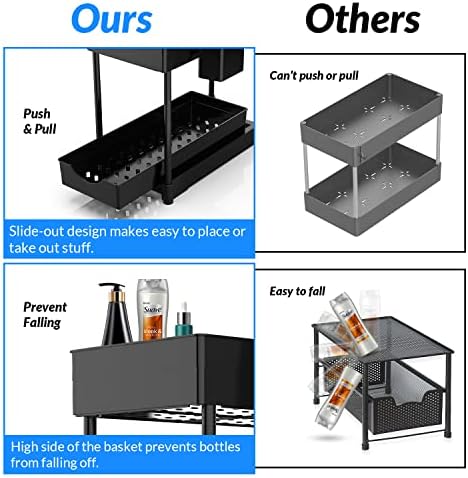 2 Pack Underneath Sink Organizer with Sliding Storage Drawer, 2 Tier Underneath Sink Organizers and Storage with 4 Hooks and a pair of Hanging Cups, Multi-purpose Underneath Sink Storage for Kitchen Toilet Cupboard, Black