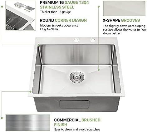 【Included within the Package deal】25 inch topmount sink (the minimal cupboard dimension is 28 inch), drain strainer, roll drying rack, backside rinse grid, mounting {hardware}, cutout template and set up instruction.