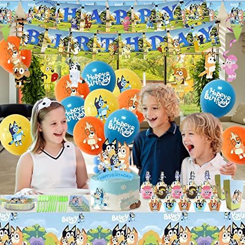 266 Pcs Blueys Birthday Occasion Provides Consists of Birthday Banner, Pennants, Latex Balloon, Hanging Swirl, Sticker, Cake Topper, Cupcake Topper, Goody Bag, Invitation Card, Blowouts, Serviette, Tablecloth, Popcorn Field, 20 Set for Tablewares