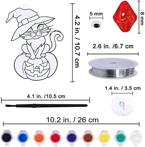 Amount: 27 Units Halloween Suncatcher Package contains 27 pcs suncatchers in 9 assorted Halloween designs, every design has 3 pcs. Package deal additionally comprises 300 pcs colourful acrylic beads, 1 set of 8-color acrylic paints, 2 rolls of fishing threads and 27 pcs suction hooks.
