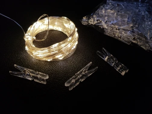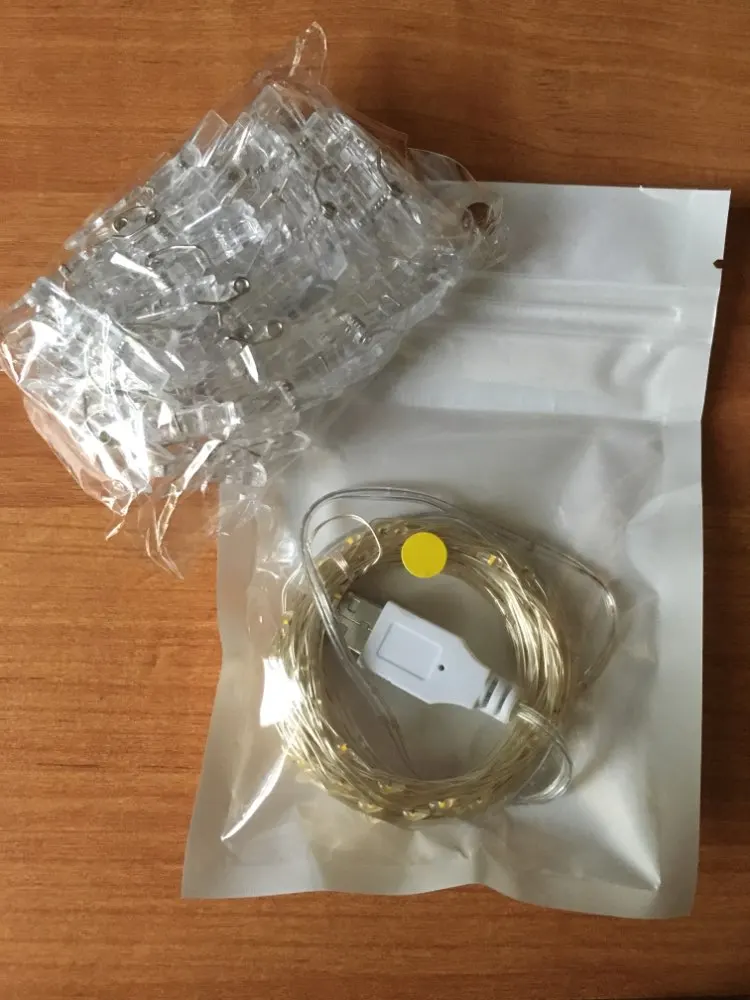 Garland bright, complete with 30 transparent clothespins. All as in the photo. Light bulbs though tiny, but heated strongly. But also shine bright