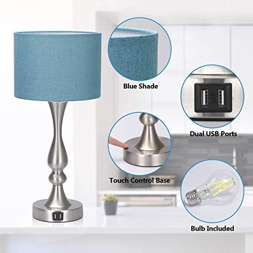 3-Manner Dimmable Contact Management Desk Lamp with Twin USB Charging Ports, Bedside Contact Lamp Fashionable Accent Lamp with Blue Lampshade, Bed room Nightstand Lamp for Dwelling Room Workplace, 6W LED Bulb Included