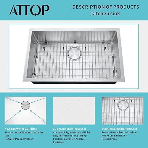 30 Inch Kitchen sink with faucet, ATTOP 30”x18” Undermount Handmade Stainless Metal Kitchen Sink Single Bowl Basin Faucet Combo in With Grid and Strainer