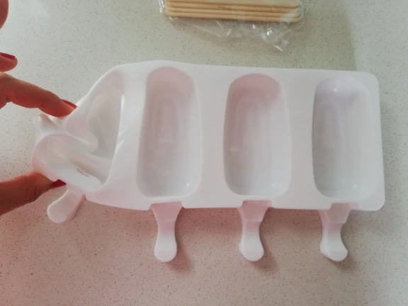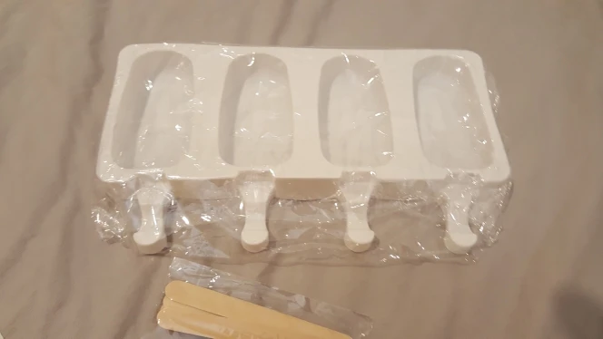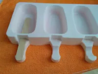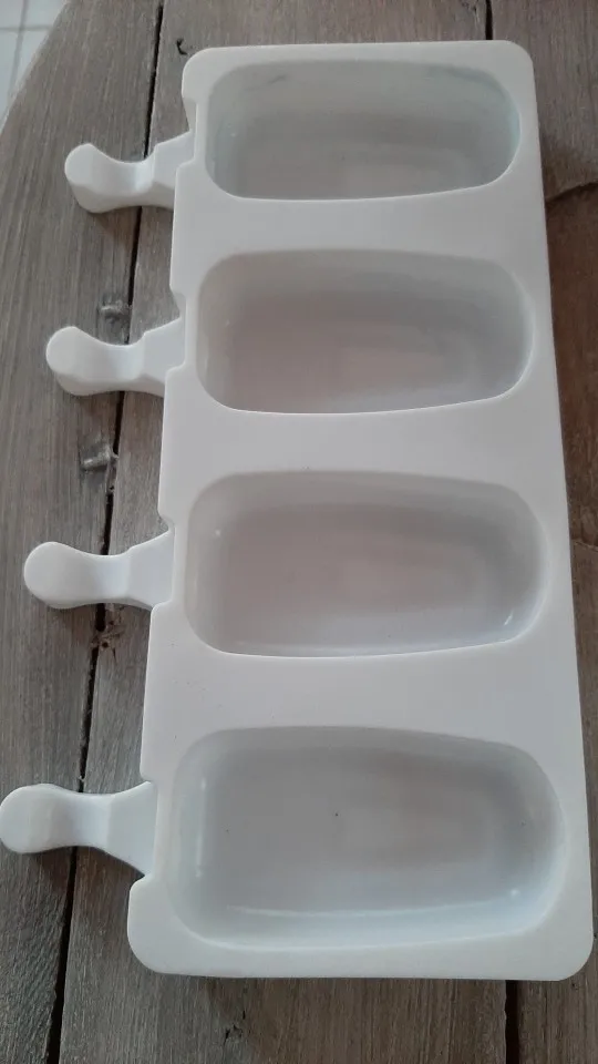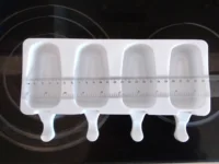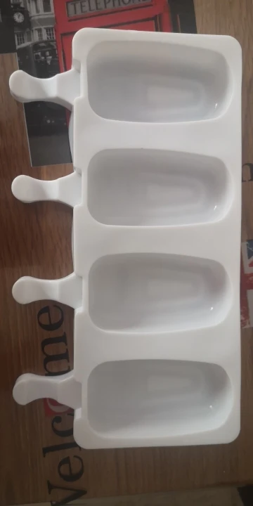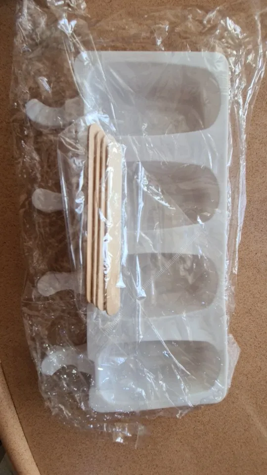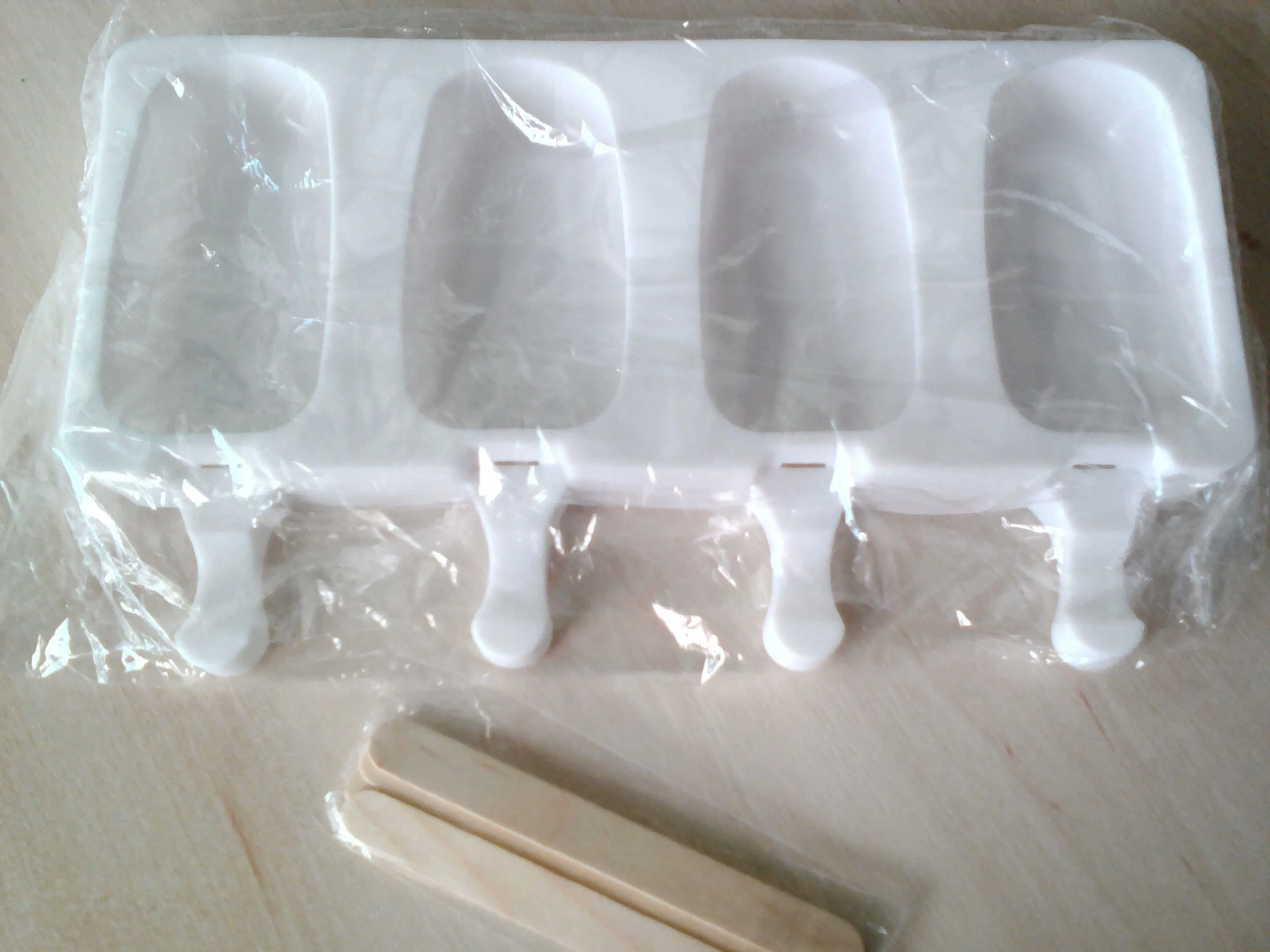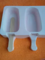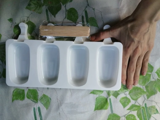 Доставка 6 недель до СПб, силикон белого цвета, без запаха, очень тонкий, поэтому надо класть на жёсткую поверхность или дошечку. Соответствует описанию. Жалко что нет крышки, если положить одну форму на другую, содержимое пачкает низ верхней формы, это не удобно и грязно. Мороженое получается и доставать его легко. Заказывала 2 формы, пришло 8 палочек.
