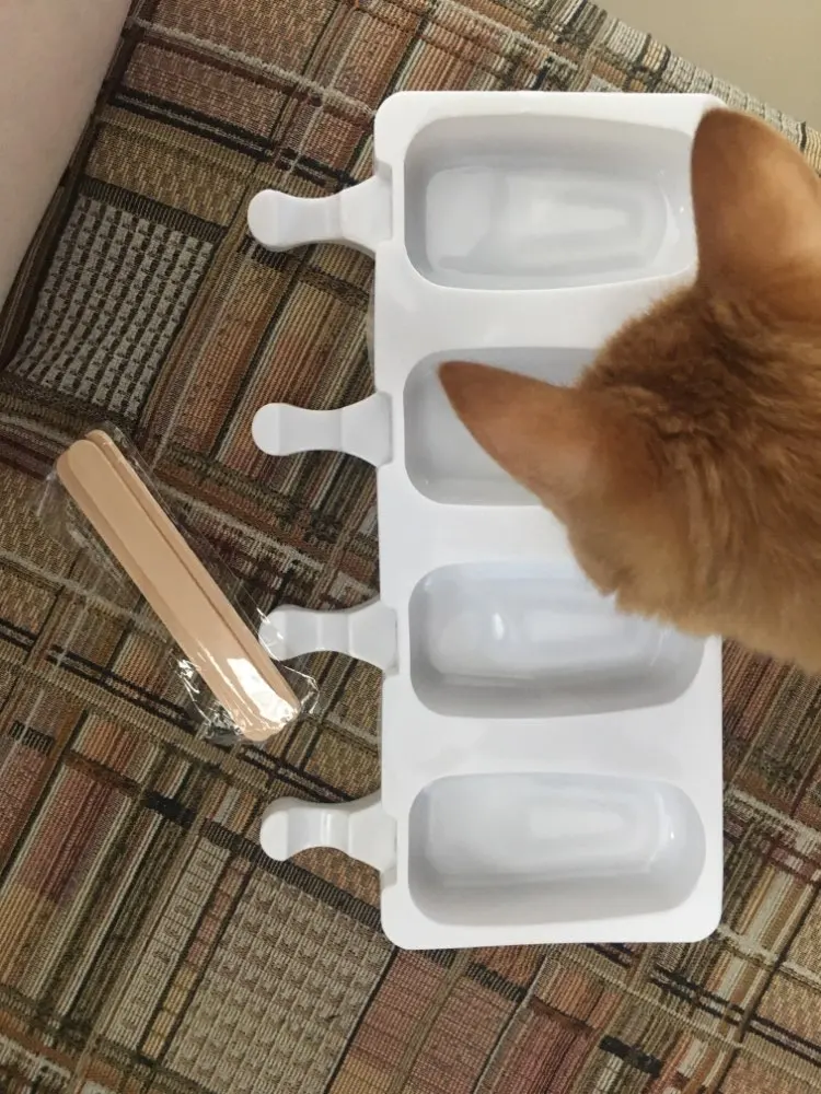 Формочки хорошие. В комплекте шли 4 деревянных палочки (толстенькие, качественнее, чем в продуктовом магазине). Кот помогал распаковывать хд