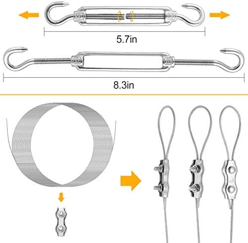Bundle contains: 1 set of rectangle shade sail {hardware} equipment ( 2pcs adjustable turnbuckles+ 4pcs padeyes+ 2pcs snap hooks+ 16pcs screws+ 16pcs plastic growth pipes), 4pcs M3 2-post cable clips, L socket wrench, screwdriver, 50ft wire rope