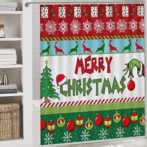 4Pcs Merry Christmas Bathe Curtain Set with Non-Slip Rugs, Bathroom Lid Cowl and Bathtub Mat, Xmas Winter Vacation Toilet Decor with Hooks 72 x 72 Inches