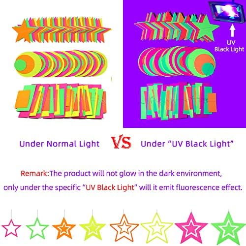 【GREAT VALUE 】 Package deal Embrace: 30 Ft/2pcs Star neon garland; 30 Ft/2pcs Spherical dot fluorescent garland; 12 Ft/2pcs Rectangle neon Strip; 406 Ft /4 Rolls lengthy neon glow streamers; 30ft/10 Pcs neon glow Swirl Streamers;8pcs Glow Star ornaments.