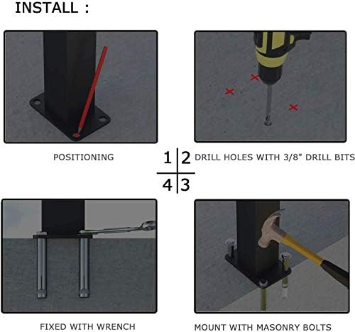 EASY TO INSTALL:1,Positioning;2,Drill holes with 7/16″ drill bits;3,Mount with masonry bolts;4,Fastened with wrench.