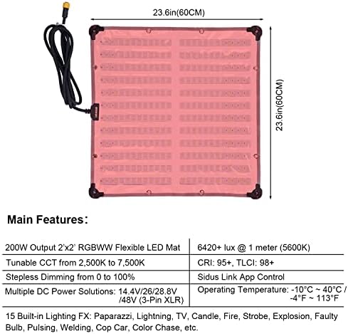 200W Output 2’x2’ RGBWW Versatile LED Mat, 240W Max Energy Draw
