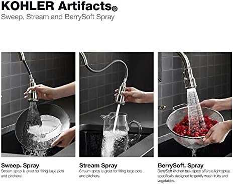Artifacts single-hole kitchen sink faucet with 17-5/8″ pull-down spout and turned lever deal with, DockNetik(R) magnetic docking system, and 3-function sprayhead that includes Sweep(R) and BerrySoft(R) spray