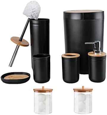 Rest room Equipment Set, Set of 8 Piece Plastic Reward Set Toothbrush Holder,Toothbrush Cup,Cleaning soap Dispenser,Cleaning soap Dish,Rest room Brush Holder,Trash Can,Cotton Swab can for Rest room (Black bamboo-8pcs)