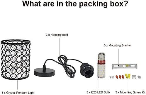 Bingotec 3 Pack Crystal Pendant Gentle Fixtures, Fashionable Pendant Lighting for Kitchen Island, Dinning Room, Bed room, with 3 Shade Temperatures LED Blub, Adjustable Hanging Top, Black