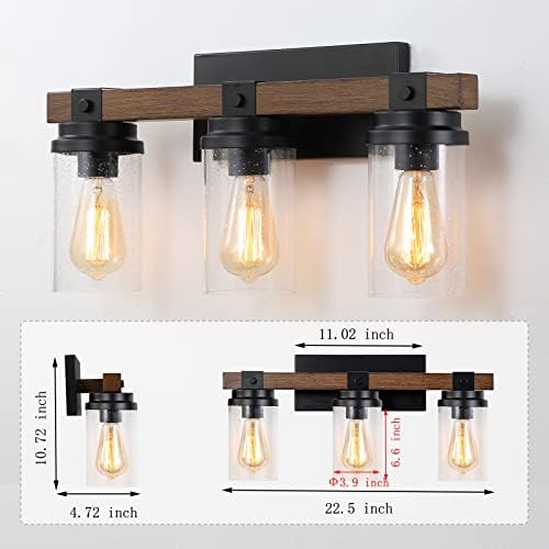💡【BATHROOM LIGHTING ART DESIGN】 Farmhouse Toilet Gentle Fixtures -[Appearance design]: Matte black end craft and imitation wood bracket combines retro & industrial kinds; -[About lighting effect design]: Seeded Glass Lampshade including a contact of artwork to the vainness lighting.