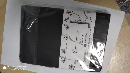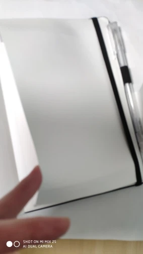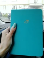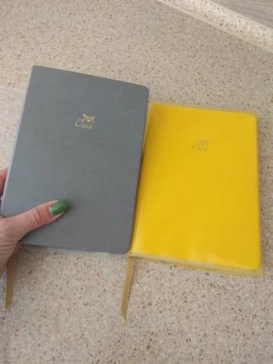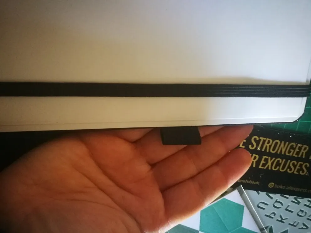 I really liked the quality, the delivery is fast. In the notepad there is a bookmark, an elastic band, a pocket behind and a holder for the pen. The cover is rigid, as stated, the paper is dense.