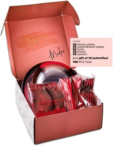 BY MADEE Heavyweight Disposable Dinnerware – Crimson & Clear 150 Piece Set for 25 Friends – Dinner & Salad Plates, Silverware & Present of 3D Butterflies – Premium Social gathering Provides
