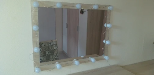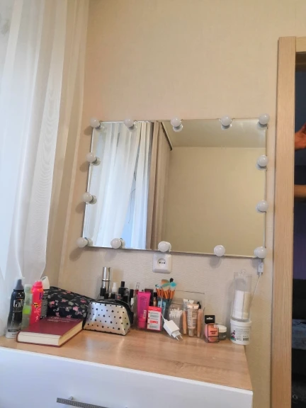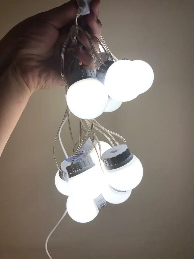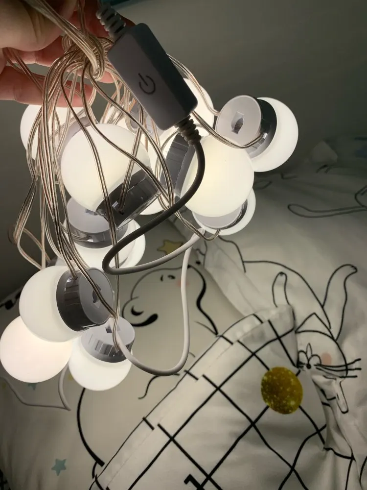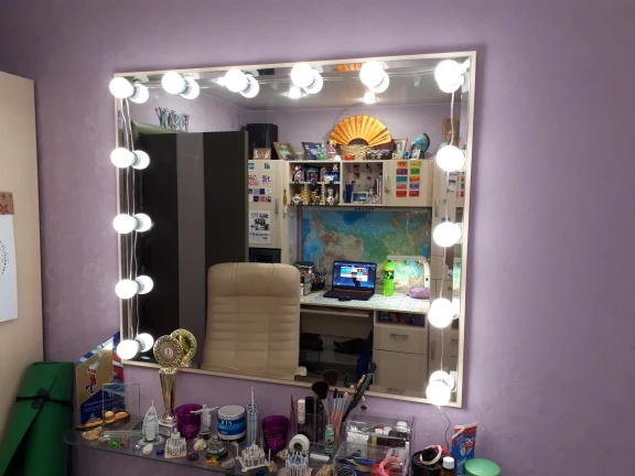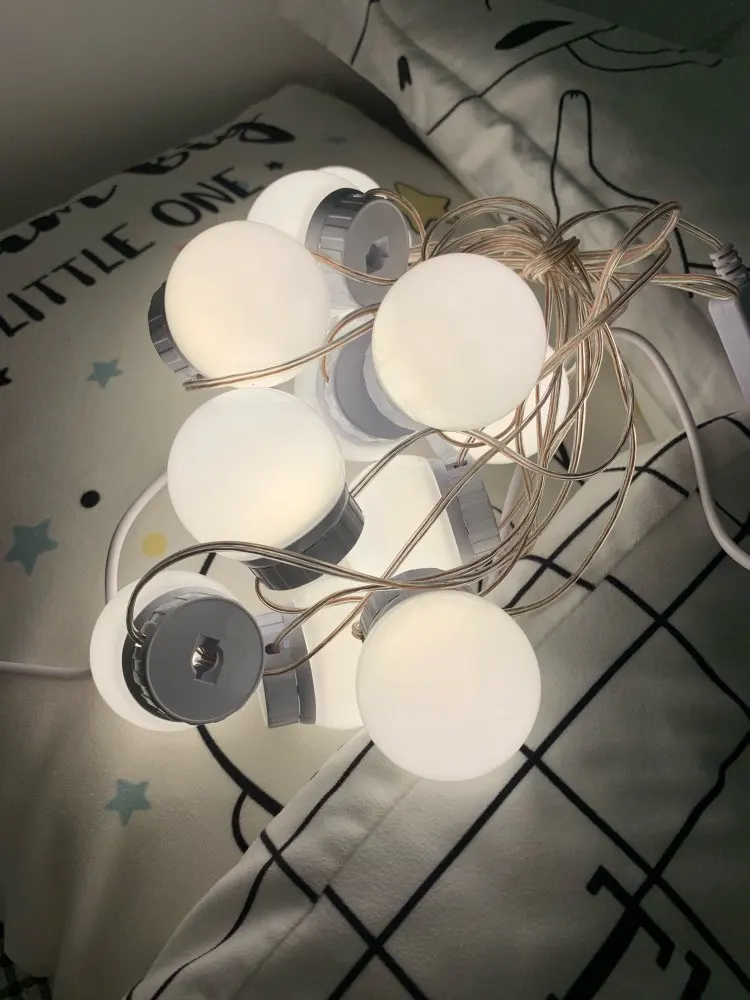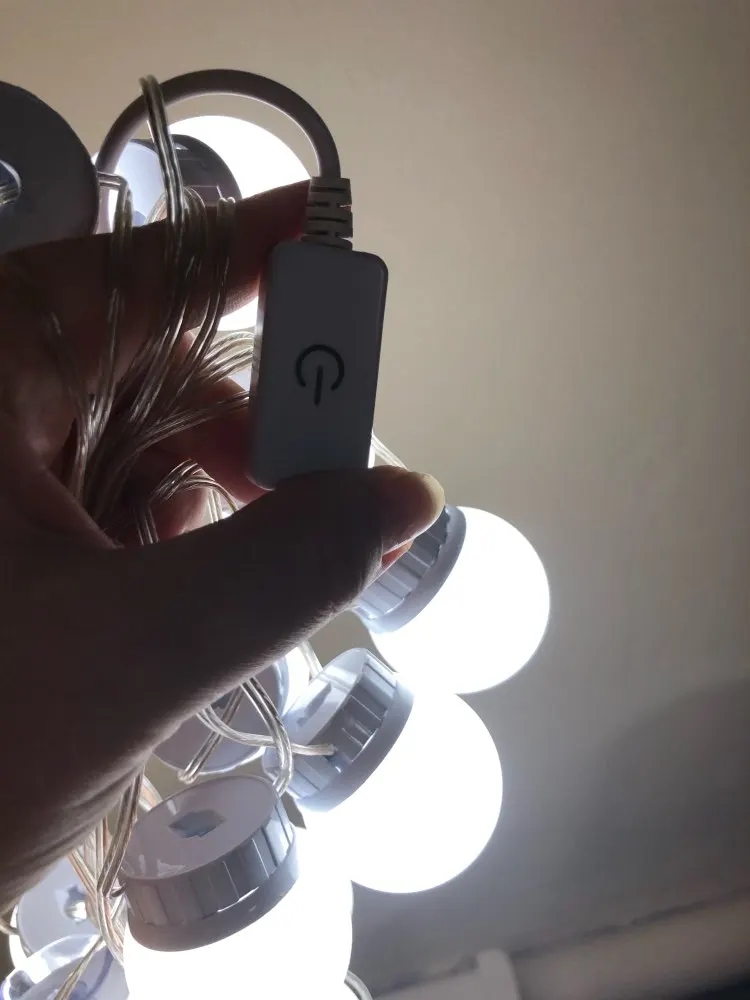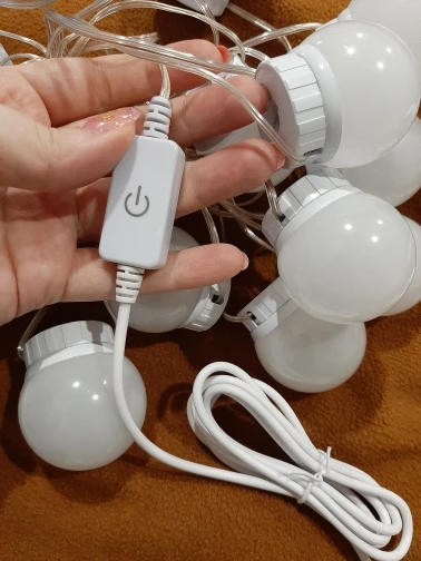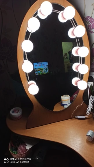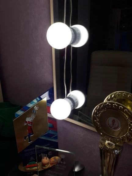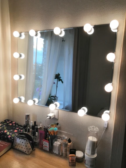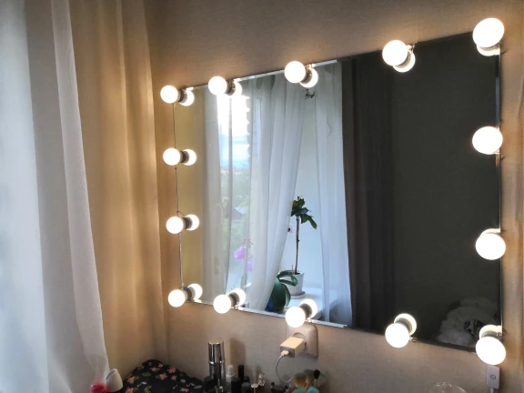 Прибыли лампы быстро, дней за 20. Описанию соответствуют. В коробке: 10 ламп, липучки, присоски и инструкция. Дополнительно нужен USB адаптер для розетки, мощностью не менее 5V 2A (согласно инструкции). Липучки отлично приклеиваются, просто намертво. Надо быть аккуратнее, чтоб сразу ровно всё приклеить, ибо второго шанса не будет (не знаю, что делать, если что сломается или перегорит и надо будет как-то менять). На зеркало размером 40х60 см освещения для “красоваться и макияжиться” вполне хватило (клеила на деревянный край туал.столика, отступив на пару см. от края зеркала по его периметру). Свет ламп приятный, ближе к тёплому. Диммер сенсорный, прибавляет и убавляет яркость. Провод втягивается и вытягивается из основания ламп путём их кручения, чем регулируется длина провода между лампами. Покупала данную подсветку по скидке продавца + купон Алиэкспресс. Вышло: 10 ламп за 722 руб. Вполне довольна, Продавцу спасибо!