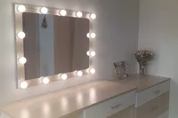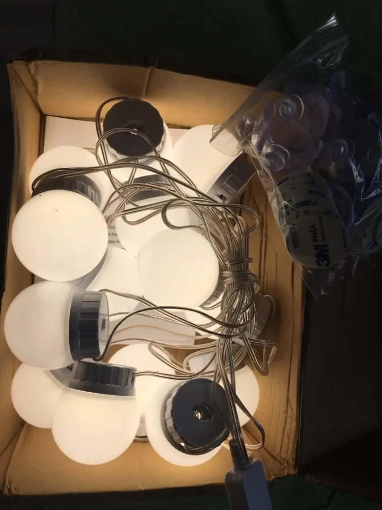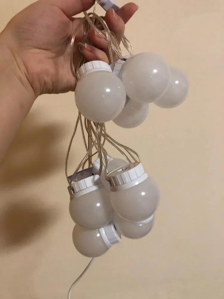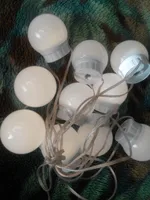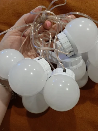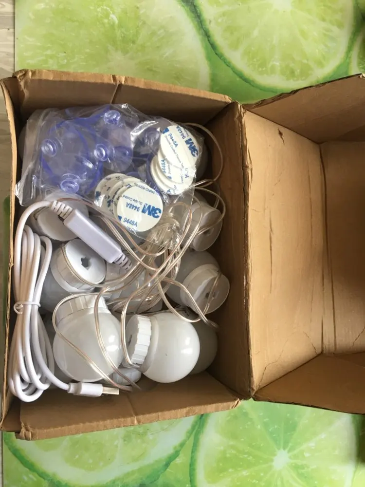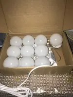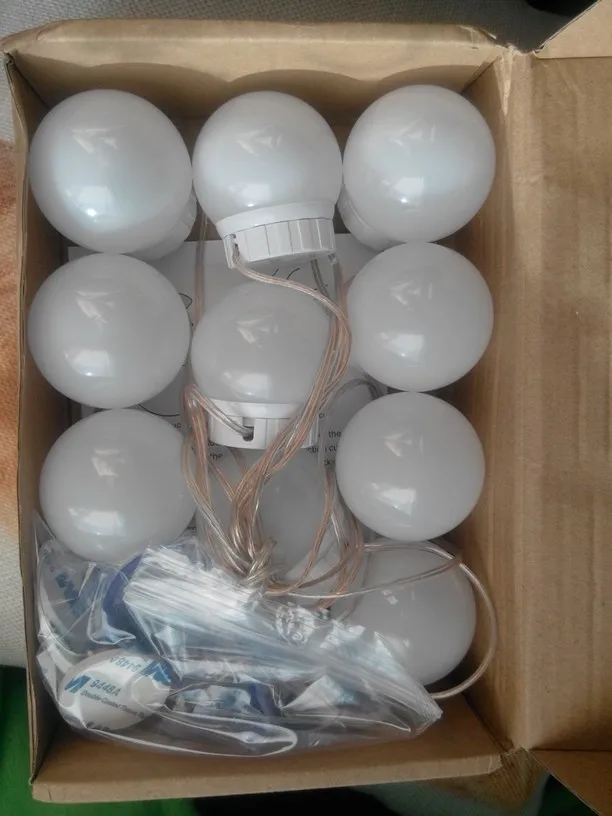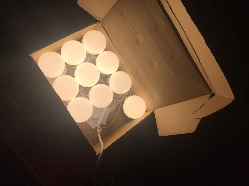 Super fast shipping!! In just 13 days to Len. area. Light bulbs as in the description. Set itself for 20 minutes from unpacking to the end of the adjustment of the length of the wires. In the box instruction, light bulbs and their choice of fastening: two-sided thick tape and Velcro. I chose scotch. I draw your attention: the glue on the tape is very strong, aim at once, then do not remove it already. First you need to mark on the frame or mirror places where the lamps will be fastened, then glue them, and at the end already twist the wires. Voila! It looks just Superski!!!! The brightness of the light is regulated by the long holding of the on/off button from the muted intimate to the dazzling bright. Thank you to the seller for the excellent product and fast delivery! Good luck!))