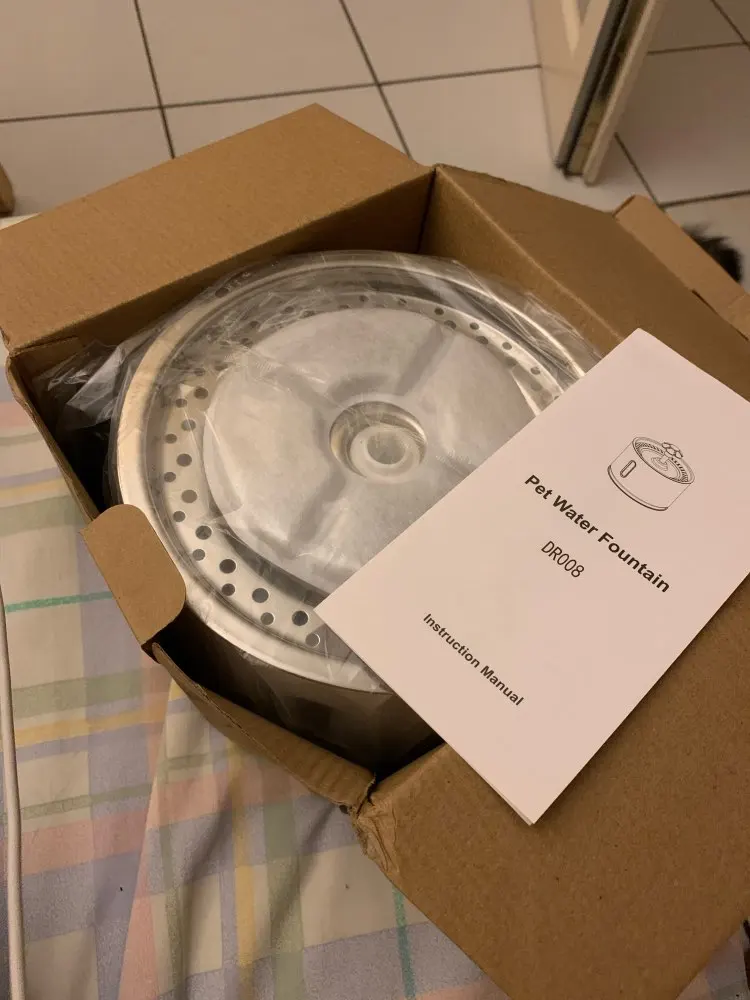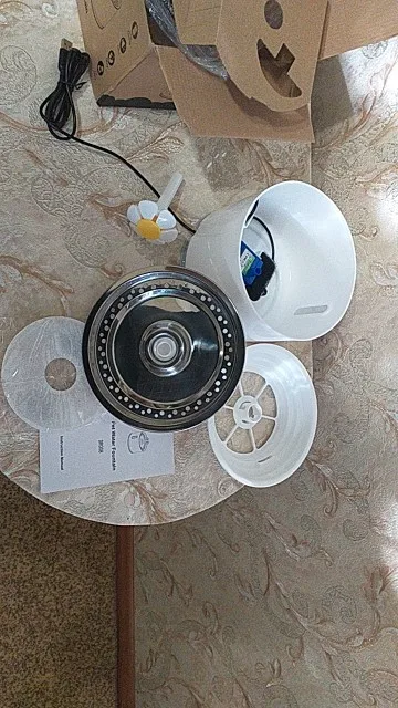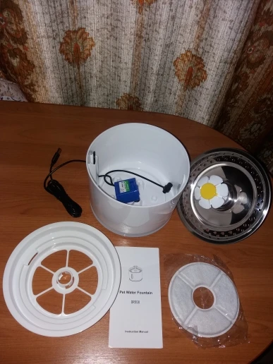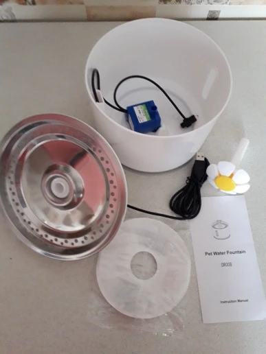 The packaging was crumpled, but the goods inside were not damaged. Assembled easily, cord without adapter, 1.5 m. Quiet, not small. The cat is happy, immediately realized what’s what. The water is delicious. I hope it will last a long time.