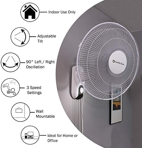 Consolation Zone CZ16W 16-Inch 3-Velocity Highly effective Air Movement Wall Mount Home Fan Adjustable Tilt Head, Variable Size Timer in White