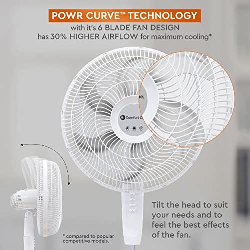 Consolation Zone PowrCurve 18″ Stand Fan – 6 Blades, Tri-Curve Grill for Much less Noise – 180° Adjustable Tilt, 3-Velocity Button Management
