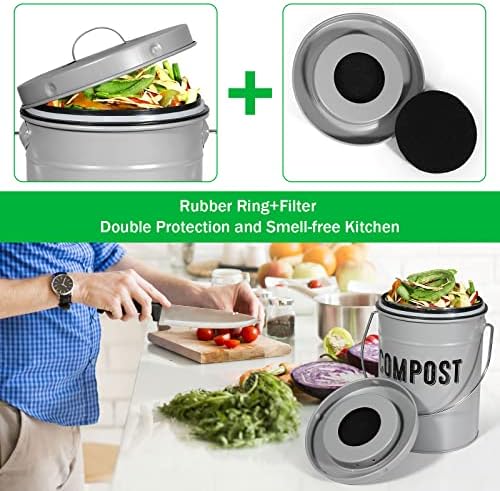 ♻️【What You Get】: 1*pack 1.0 Gallon metallic outer Compost Bin Kitchen, 1*pack inside bucket with high-quality plastic materials(simply detachable to take out and simple to scrub), 2*pack Charcoal Filters(use time as much as 6 months), 2*pack two silicone rings(ensure the lid and Compost Bucket are tight to forestall unhealthy odor leakage).