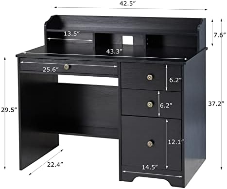 Pc Desk with 4 Storage Drawers and Hutch Shelf, Wooden Body Dwelling Workplace Desk with Extensive Tabletop, Industrial Classic Type Govt Desk Writing Examine Desk PC Desk, Black