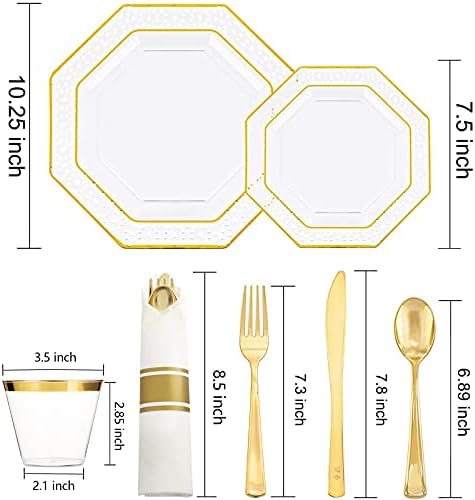 ELEGANT DESIGN: Octagonal gold plastic plates disposable have two gold rims and clear lace design are elegant, the high-end look that can add a pleasant contact of curiosity to a spot setting. However bear in mind that the sauce or soups might leak by way of the lace edges.