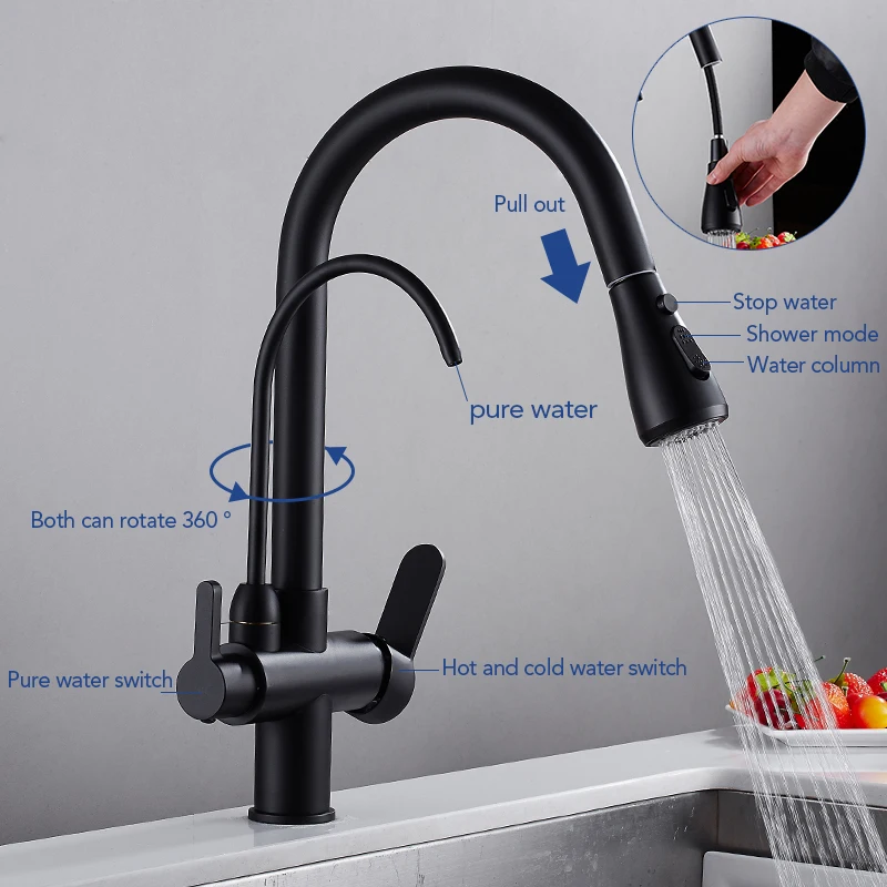 Specification: Deck Mounted Black Kitchen Taps Pull Out Scorching Chilly Water Filter Faucet for Kitchen Three Methods Sink Mixer Kitchen Faucet ELK9139B