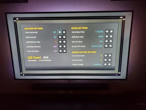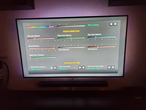 Everything works right, looks great. But, the settings are very knocked down, first upset, then 2 hours tuned and voila, all colors are transmitted as on TV. Immediately the color was not white and pink, yes all the colors were knocked down, the dark areas did not capture at all, the photo of my settings attached, may depend on the model TV, I have Sony kd65. I took 60 diodes, I like it. Connected corners, much faster and more convenient than soldering. 5 m was enough for 65 “, left cm 30. The kit is complete, there is everything you need, even special screws to TV, corners the seller gave. Works everywhere except TV (CAM module) and PS4, it is clear there HDMI. The delay is small, but not critical. 4K with working light brakes, lack of power, with 1080r no problems. It starts itself. The Ambilight app at the time of writing a review is worth 199R.