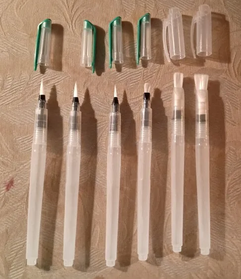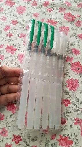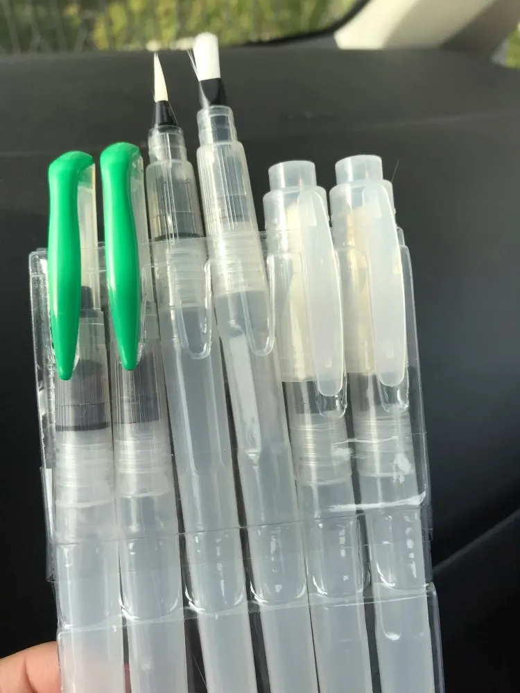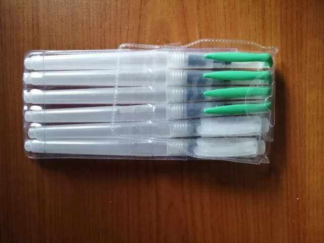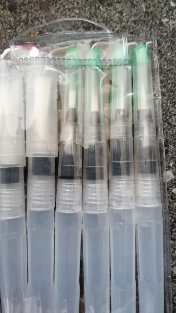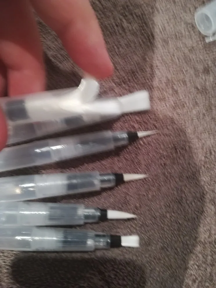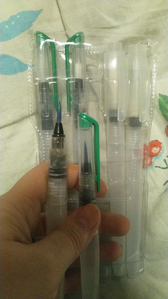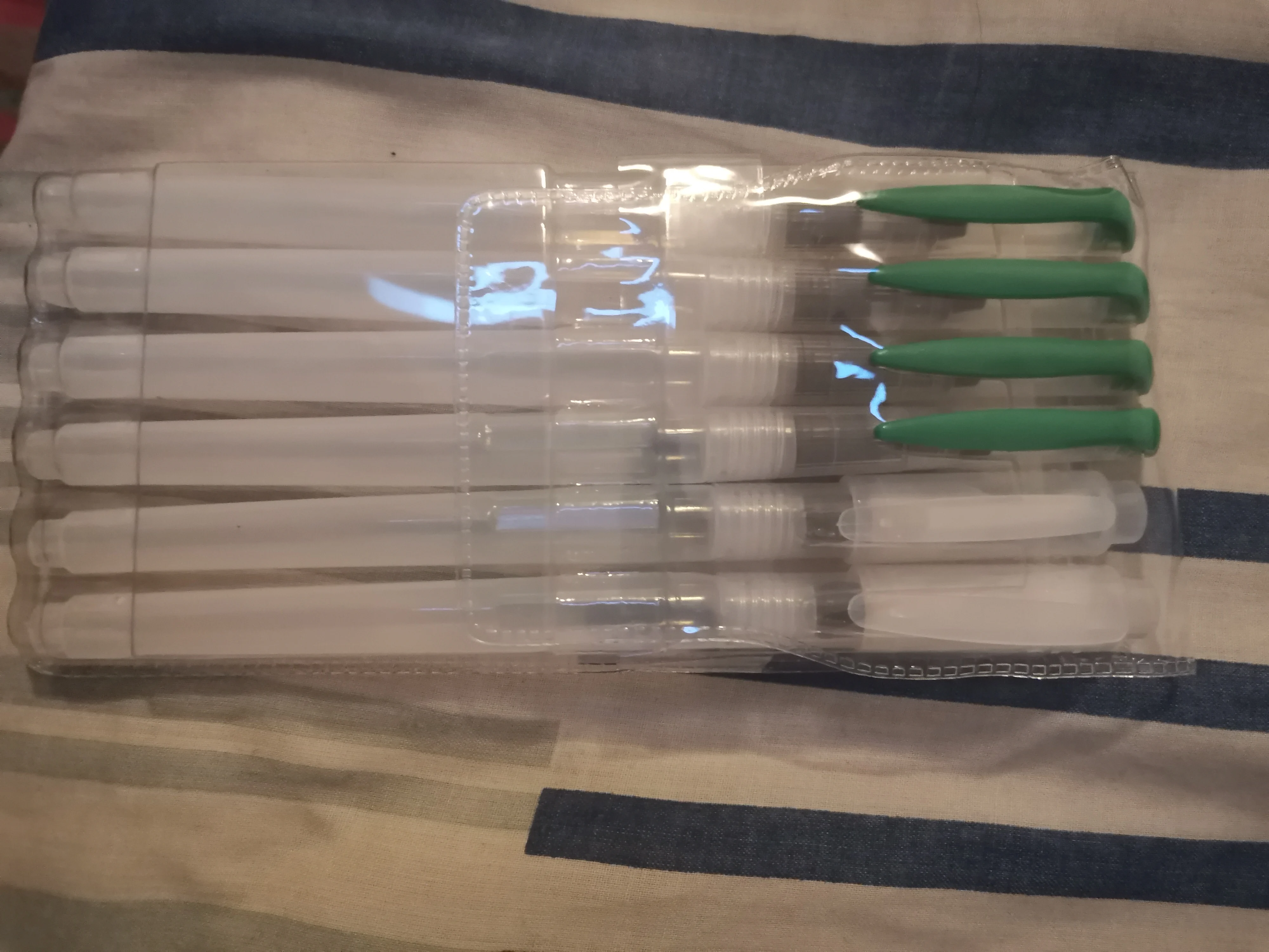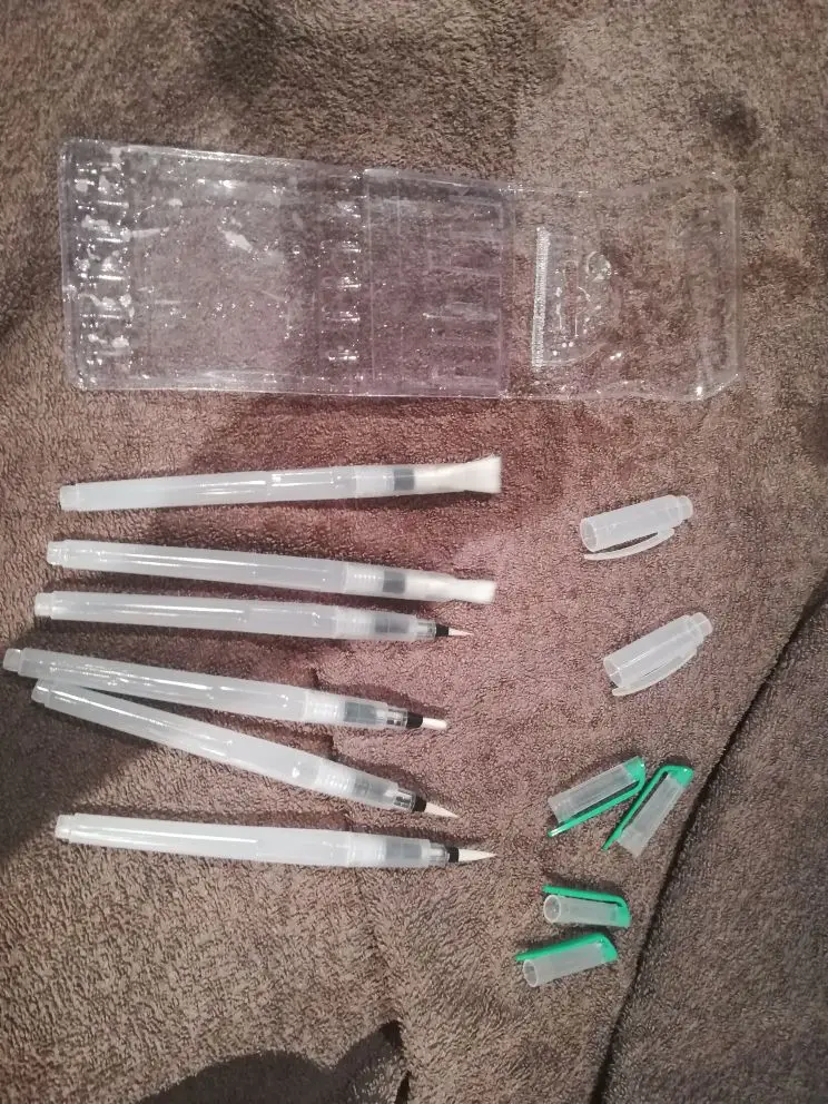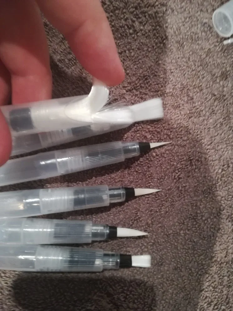 The bristles of the three small brushes were greasy and sticky. I had to clean it with soap. It feels wired now though somewhat better. I don’t understand how or why this could be. It looked clean otherwise. Very strange. After cleaning, it seems to work fine. So no complaints. Like some reviewer mentioned, the green handles keep coming off the cap, it needs a redesign! Quick shipping, seller communicates well. Haven’t done any painting yet with the brushes.