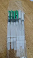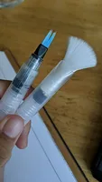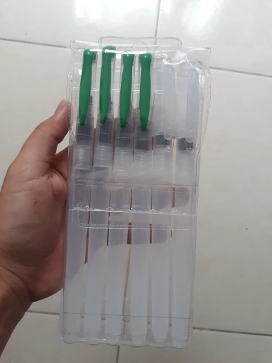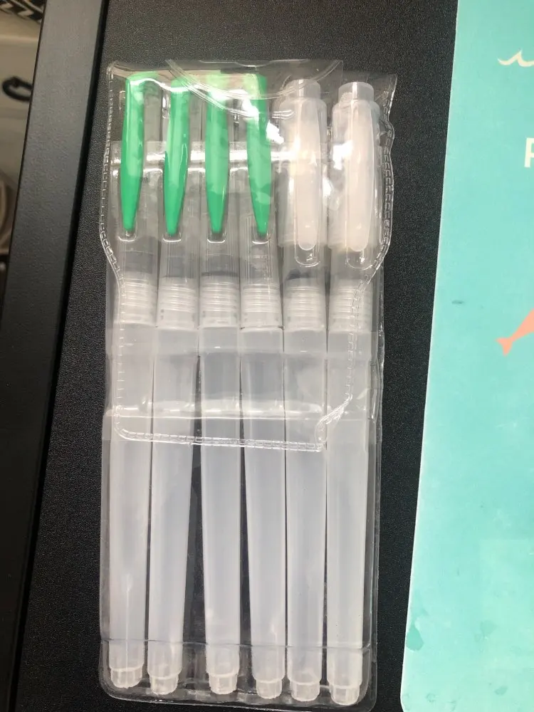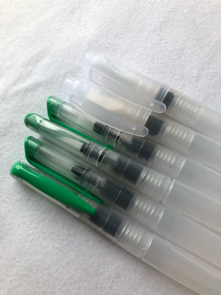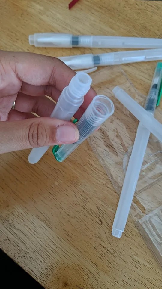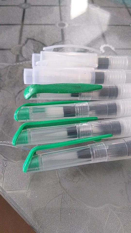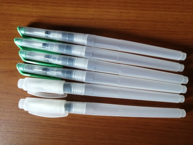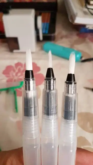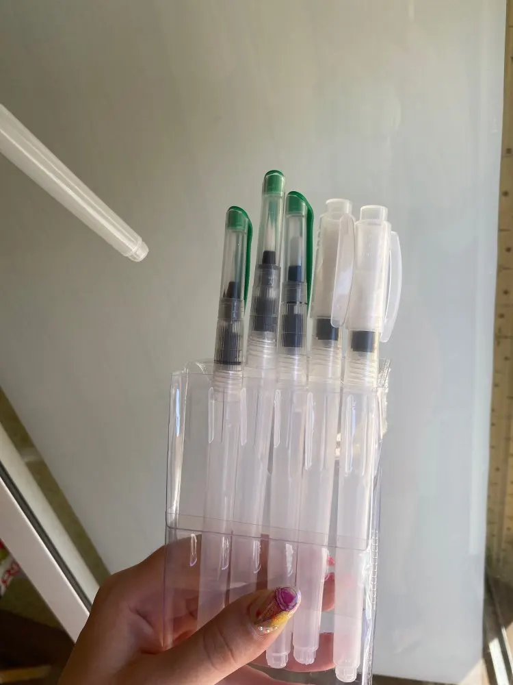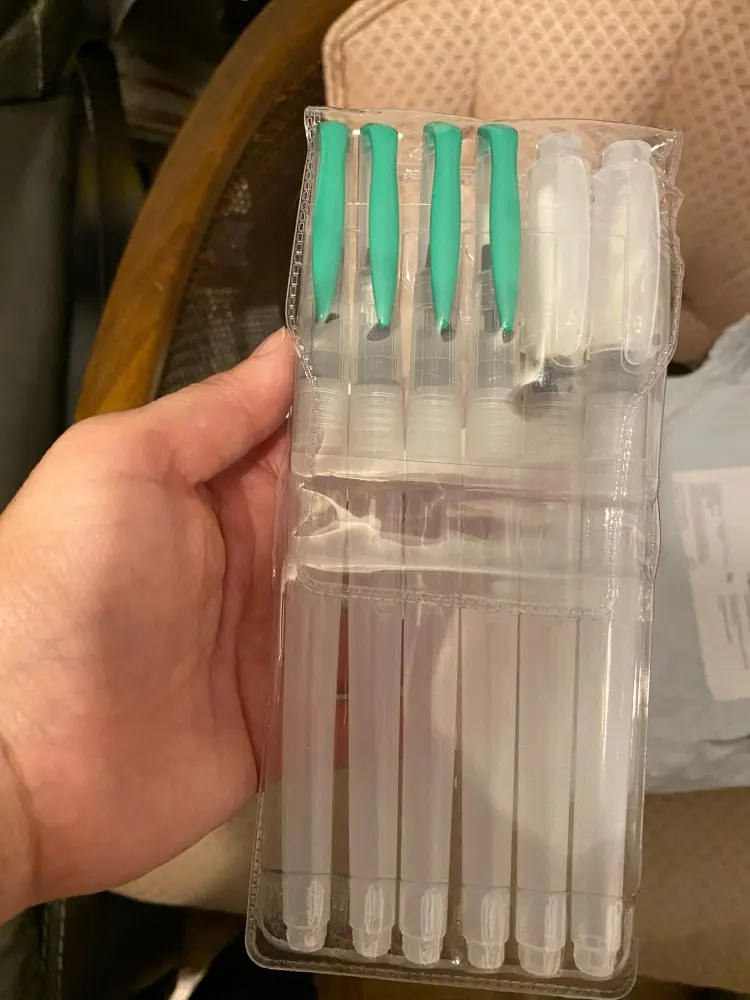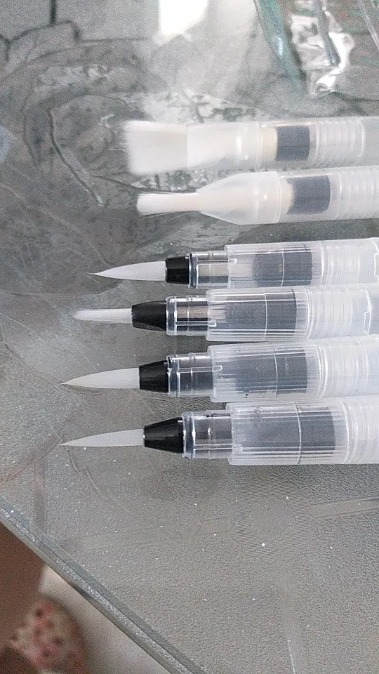 The bristles of the three small brushes were greasy and sticky. I had to clean it with soap. It feels wired now though somewhat better. I don’t understand how or why this could be. It looked clean otherwise. Very strange. After cleaning, it seems to work fine. So no complaints. Like some reviewer mentioned, the green handles keep coming off the cap, it needs a redesign! Quick shipping, seller communicates well. Haven’t done any painting yet with the brushes.
