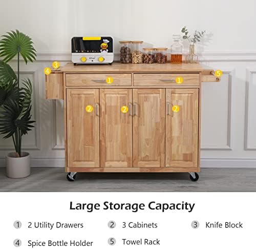 Erinnyees Wood Rolling Kitchen Island Utility Storage Cart on Wheels,54 Inches Vast,with Drawers, Door Cupboards, and Knife Block for Eating Room…