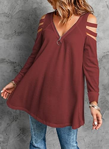 FARYSAYS Girls’s Informal Chilly Shoulder Zipper V Neck Tunic Tops Lengthy Sleeve Waffle Knit Unfastened Blouses Shirts