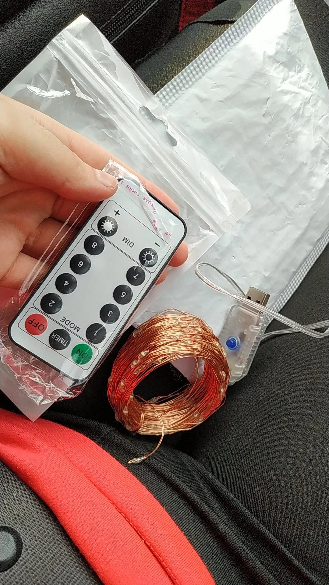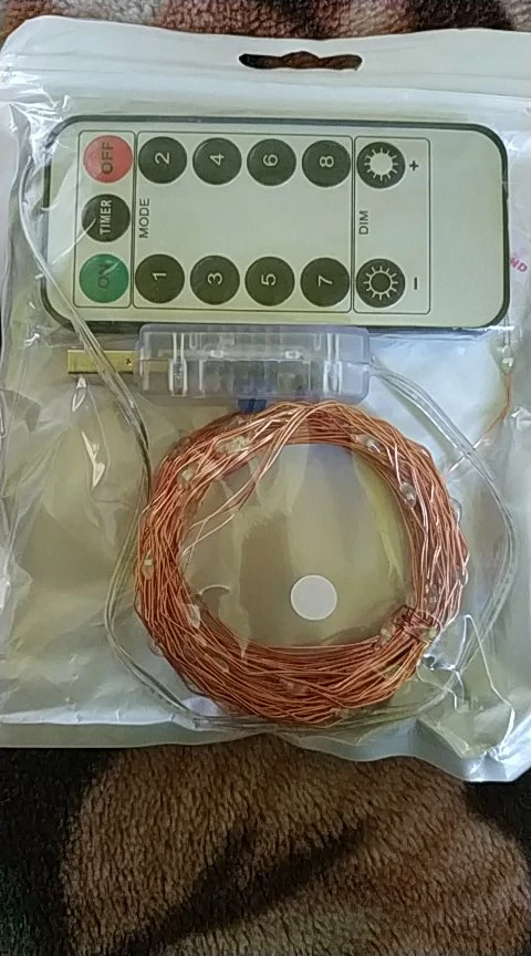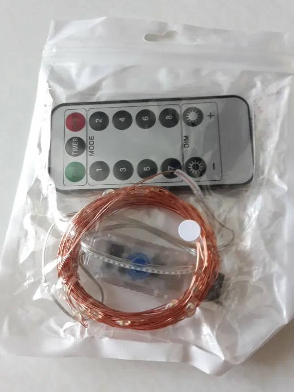 1.Combination 2.In wave 3.Sequential 4.Alternant 5.Chasing/flash 6.Slow fade 7.Twinkle/flash 8.Steady on TIMER:Time control,turn on 6 hours and turn off 18 hours circularly everyday DIM-: darken DIM+:brighten Package includes: 5M or 10M /20m Copper wire led light with remote control