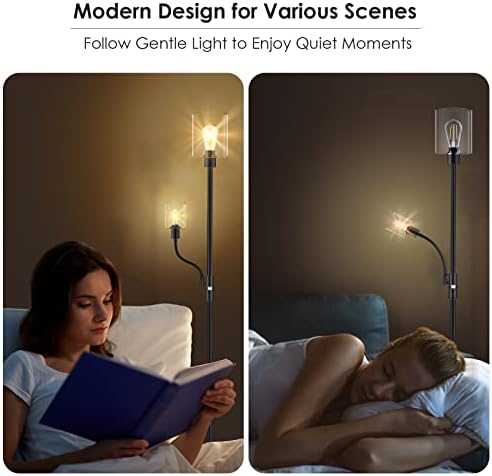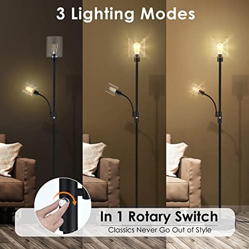 Ground Lamp, Glass Standing Lamps, 6W Black Trendy Ground Lamp with 4W Adjustable Studying Lamp, 2700K Vitality-Saving LED Bulbs Included, Industrial Vibrant Ground Lamp for Bed room, Dwelling Room and Workplace