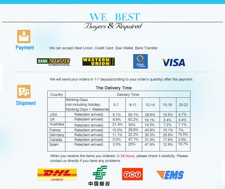 If you wish to get the merchandise quicker,please contact us to pay extra freight, we will give you the next quicker and cheaper delivery methods: UPS , DHL , Fedex , TNT , DEPX , EMS . By way of these methods, you will get the merchandise inside about 5-7 enterprise days.