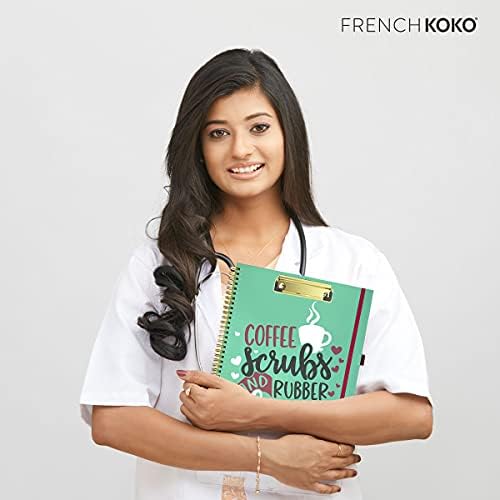 French KOKO Cute Hardcover Foldable Clipboard Folio with Refillable Lined Notepad, Inside Pocket, Robust Twin-Wire Binding, Pen Loop Ladies Nurse Trainer Workplace Provides (Scrubs)