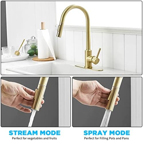 2-Mode & Pull Out Sprayer – Swap between 2 spray modes with a faucet of a button, stream for filling water. With a Pull-down spray 17.7 inches hose, kitchen sink taps gold spray head can attain the entire of your sink.