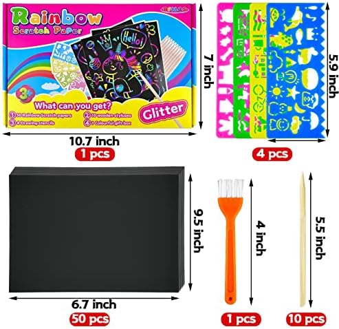 Rainbow scratch paper for Children Included: 50Pcs x Glitter black paper (9.5 * 6.7 inch), 10 x Bamboo styluses, 4 x coloration drawing stencils (5.9 * 2 inch) 1 x Brush.Scratch artwork for youths, our scratch paper artwork sheets made from good high quality and thick cardstock with black-coated floor. Create actually distinctive scratch artwork with this premium, inexpensive, and plentiful scratch artwork paper pad package.