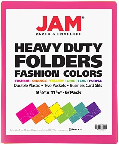 JAM PAPER Heavy Responsibility Plastic 2 Pocket Additional Powerful College Folders – Assorted Vogue Colours – 6/Pack