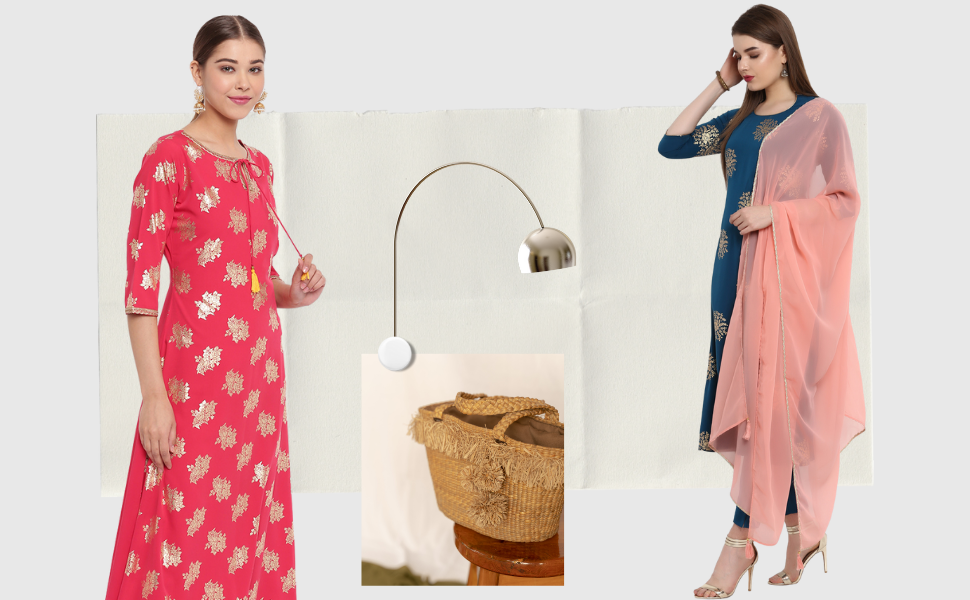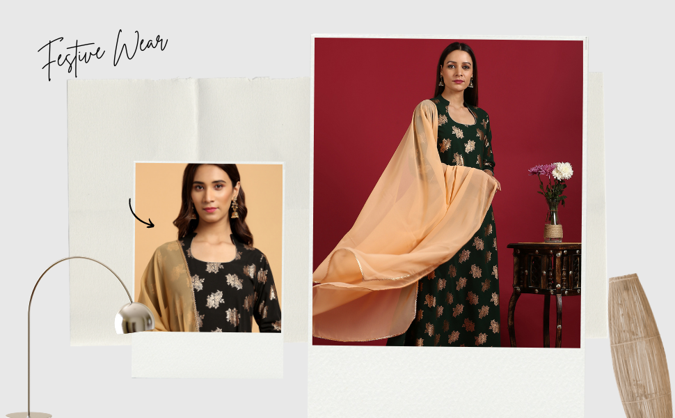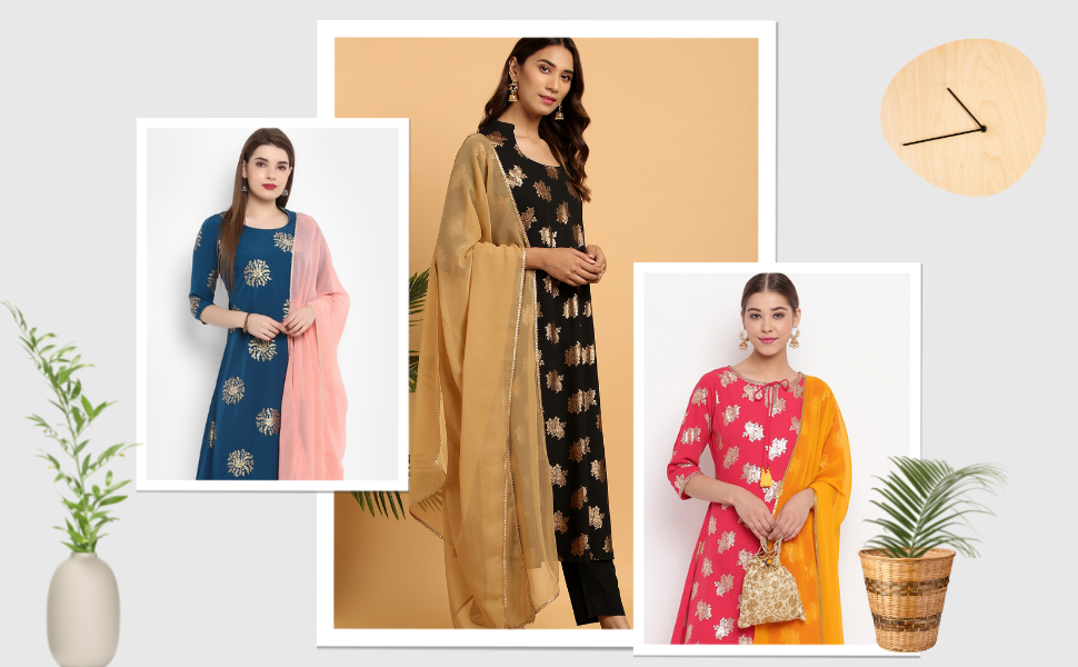 Fashion: A-Line Kurta of size 47″ with 3/4 Sleeve; Pant of size 35″; Dupatta of Size 2.25 Mtr
